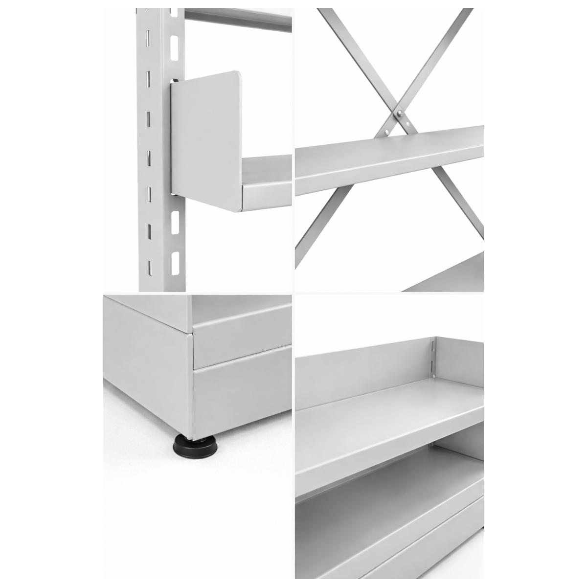 Fabricada em aço de alta resistência, conta com prateleiras reguláveis, reforço traseiro em X para maior estabilidade estrutural e base reforçada, garantindo segurança mesmo em uso contínuo e ambientes de grande circulação.