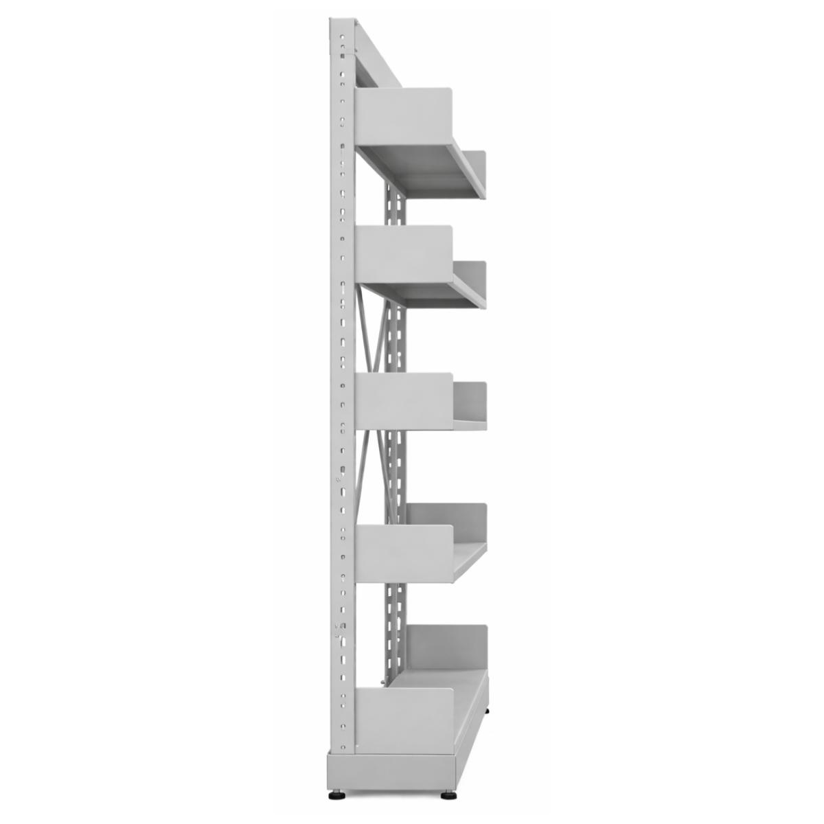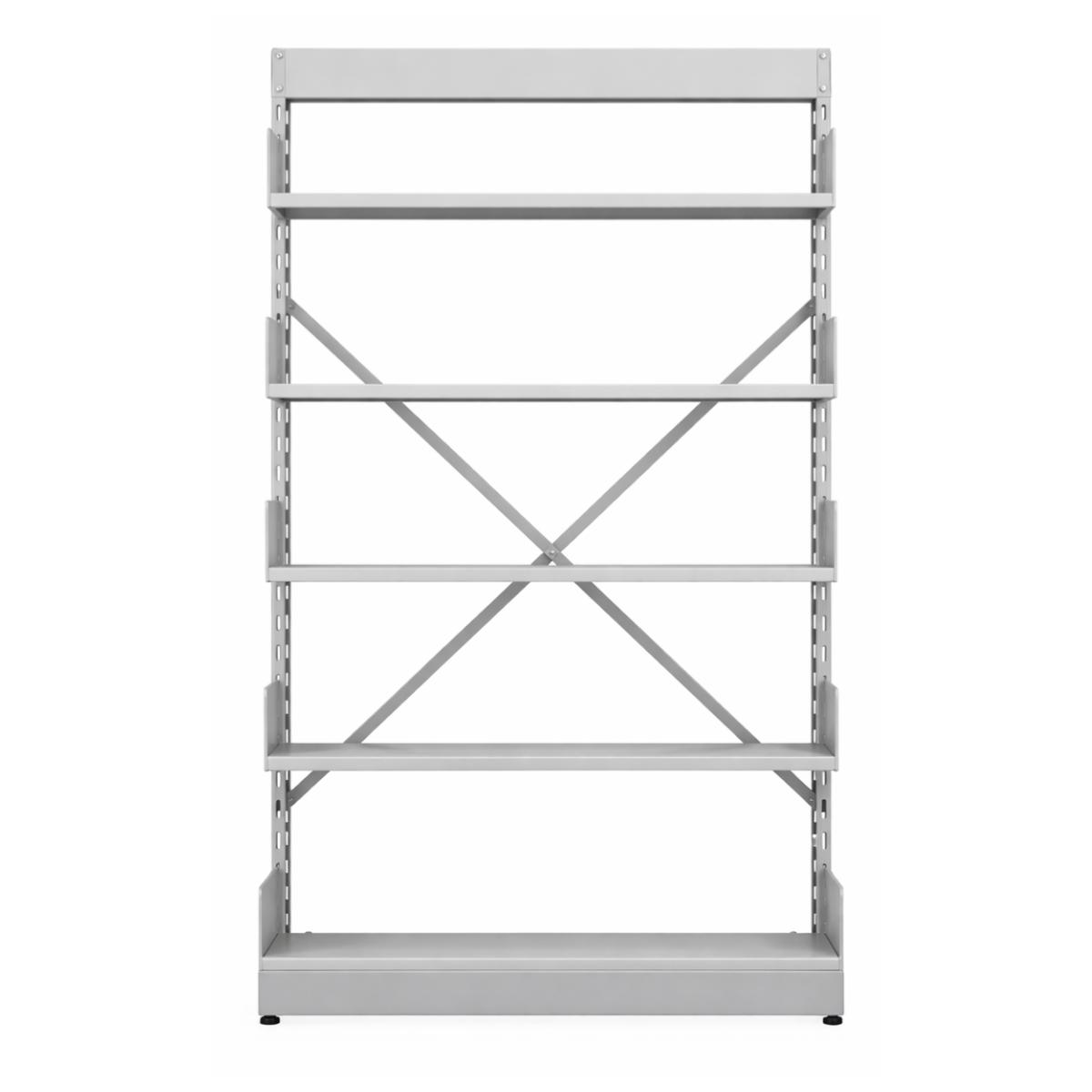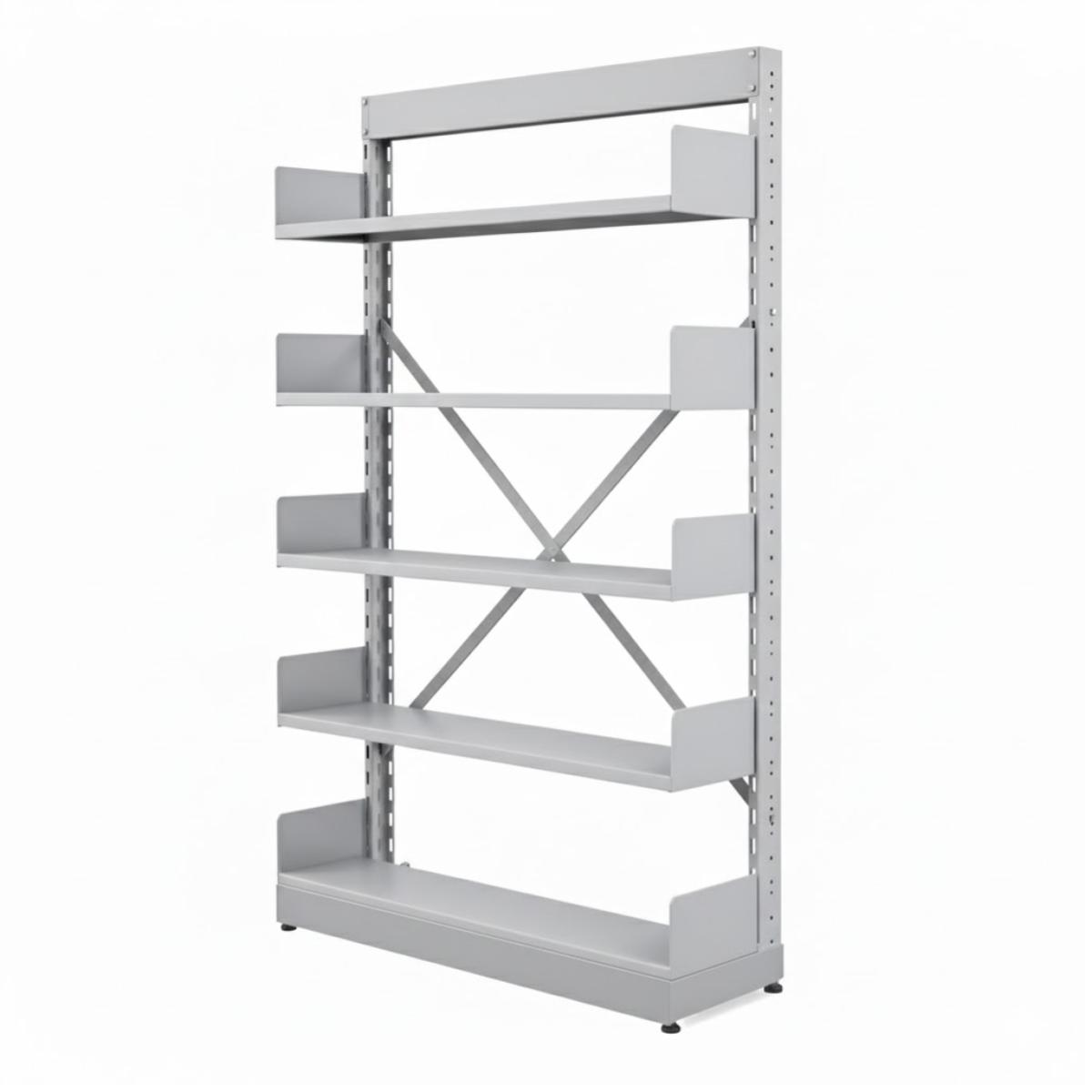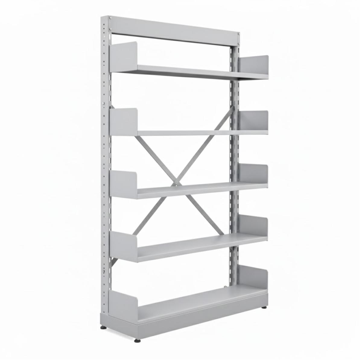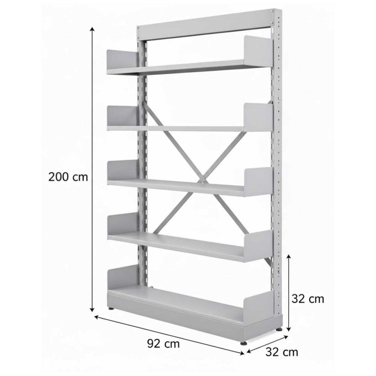 Estante bibliotecária em aço resistente, ideal para bibliotecas, escolas e escritórios. Possui prateleiras metálicas reguláveis, reforço traseiro em X para maior estabilidade e pés ajustáveis. Suporta até 30 kg por prateleira e 40 kg na base, garantindo segurança e durabilidade no uso diário.