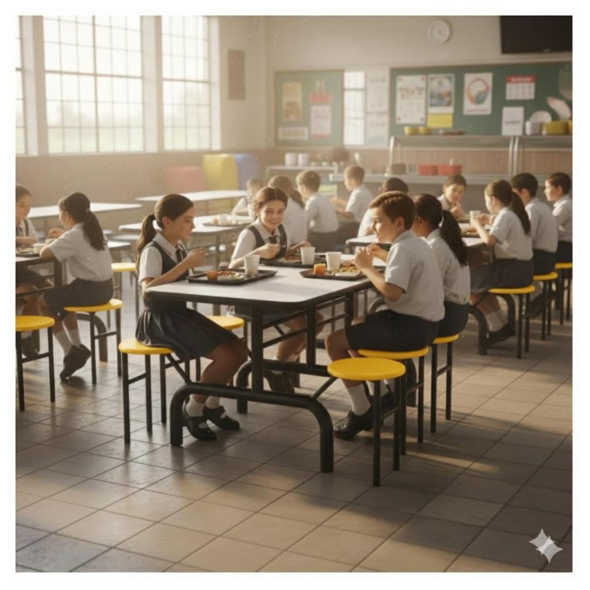 Mesa coletiva de refeitório com bancos Escamoteáveis integrados, ideal para uso em ambientes institucionais, industriais, escolares e corporativos. Estrutura metálica reforçada e assentos individuais acoplados garantem durabilidade, praticidade e organização do espaço.