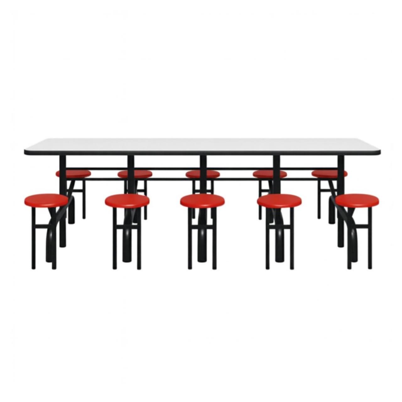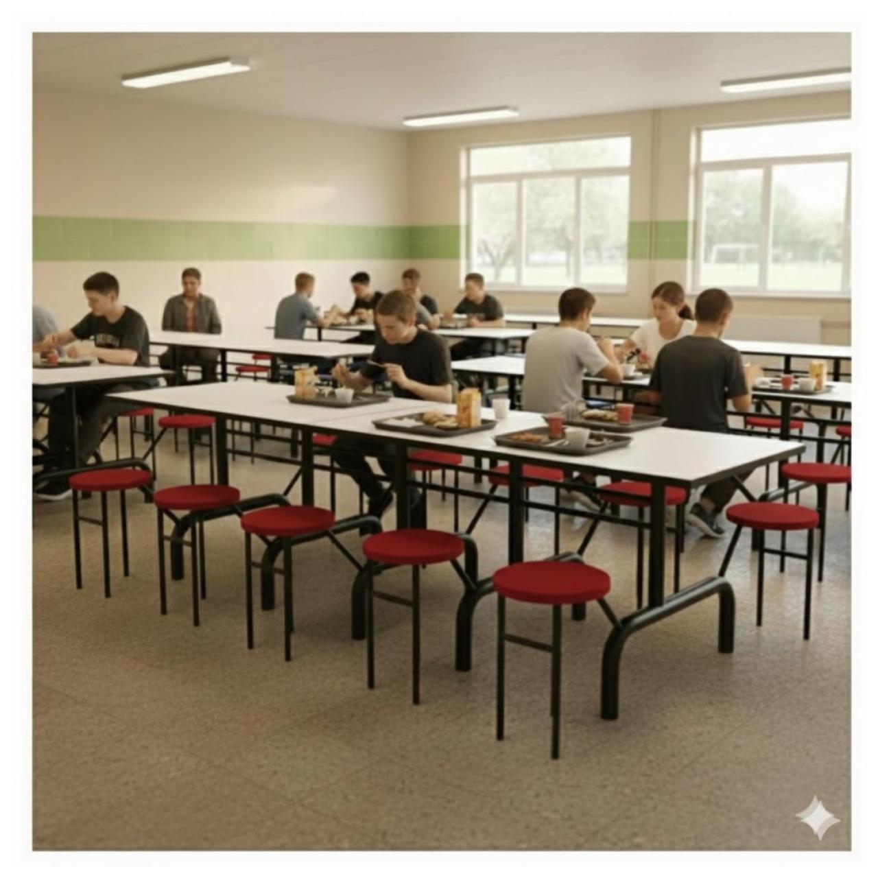 Mesa coletiva de refeitório com bancos Escamoteáveis integrados, ideal para uso em ambientes institucionais, industriais, escolares e corporativos. Estrutura metálica reforçada e assentos individuais acoplados garantem durabilidade, praticidade e organização do espaço.